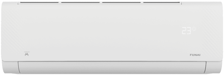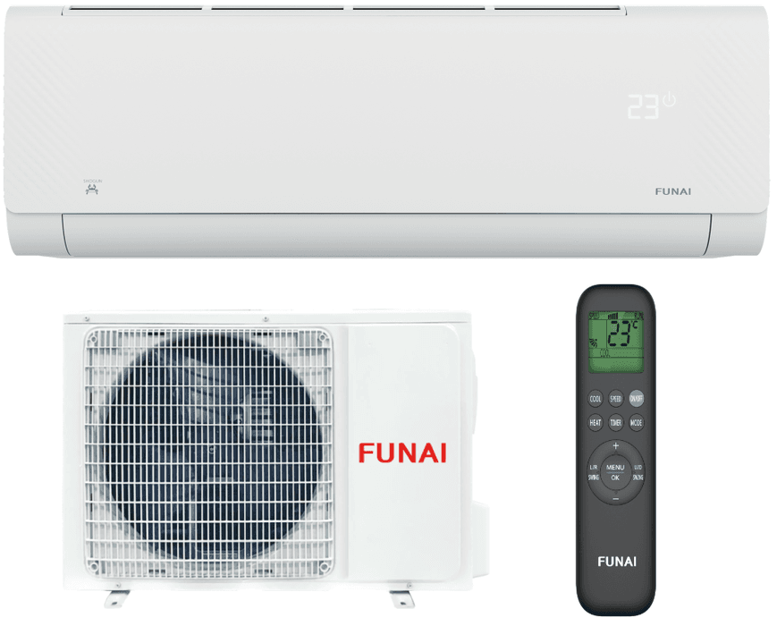 Funai (Фунаи) Shogun RAC-SG35HP.D04 – это бытовой настенный кондиционер не инверторного типа. Модель имеет элегантный дизайн внутреннего блока и прочную, надежную конструкцию наружного. Среди рабочих функций стоит упомянуть самодиагностику, умное оттаивание, самоочистку, комфортный сон, турбо, теплый пуск, таймер. Особенности и преимущества: Высокая энергоэффективность. Низкий уровень шума. Удобный пульт ДУ с подсветкой. Модуль «Ультрафиолетовая обработка» для обеззараживания воздуха. SMART Air: Автоматическое управление потоком воздуха в 4-х направлениях. 4х SMART Ion 4 дополнительных фильтра в комплекте. Wi-fi модуль. 5 скоростей вентилятора. SMART Sleep режим комфортного сна. SMART Feel отслеживание температуры с пульта. Самоочистка внутреннего блока. Функция защиты от плесени. Режим энергосбережения. Функция блокировки кнопок пульта (защита от детей). Теплый пуск. Турбо. Автоматический рестарт. Функция температурной компенсации. Запоминание положения жалюзи. Умное оттаивание. Самодиагностика. Защитные накладки на вентили. Шумоизоляция компрессора наружного блока. Виброопроры наружного блока в комплекте. Серия Shogun 2025 включает в себя 5 моделей настенных сплит-систем с холодопроизводительностью от 2.25 до 7.5 кВт. Все модели оснащены встроенными модулями Wi-Fi для удаленной настройки и комфортного управления кондиционерами из любой точки планеты через приложение в вашем смартфоне. Также каждая сплит-система комплектуется 4 фильтрами тонкой очистки с ионами серебра.
