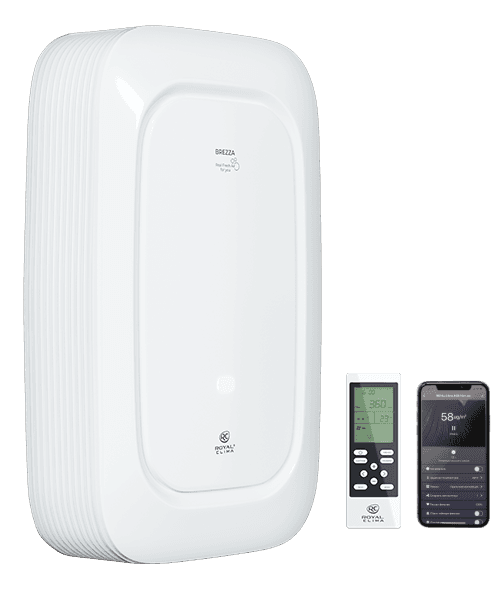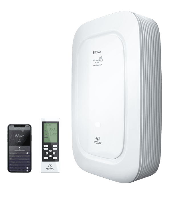 Настенный приточно-очистительный комплекс Royal Clima (Роял Клима) Brezza RCB 150 LUX подаёт свежий и очищенный воздуха до 150 м3 в час и предназначен для вентиляции квартир, офисов и частных домов. Высшая степень очистки воздуха обеспечена до 99,5%. А встроенный модуль Wi-Fi для управления с мобильных устройств позволит управлять устройством даже вне дома. Особенности и преимущества: встроенный Wi-Fi модуль для управления с мобильных устройств современный, компактный и привлекательный дизайн 5 ступенчатая система очистки воздуха: предварительный сетчатый фильтр, механический фильтр тонкой очистки F7, HEPA-фильтр медицинского класса H12, угольный фильтр и ионизатор воздуха 6 режимов работы 6 скоростей вентилятора встроенный датчик загрязнения воздуха РМ2.5 низкий уровень шума от 20 дБ(А) эргономичный дистанционный пульт управления простой монтаж в помещении с чистовой отделкой гарантия 2 года Приточно-очистительные комплексы BREZZA RCB производства итальянской компании ROYAL Clima для насыщения помещений очищенным воздухом через существующие фильтры. Для обеспечения должной эффективности подачи воздуха по всему помещению используется вентилятор с небольшим шумом и особая утончённая конструкция корпуса. Управление может осуществляться с пульта ДУ, на котором удобно настраивать все режимы работы, а также с мобильного устройства благодаря встроенному модулю WI-FI.